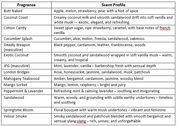 Ethylhexylglycerin, Phenoyxethanol, Essential Oils, Fragrance Oils